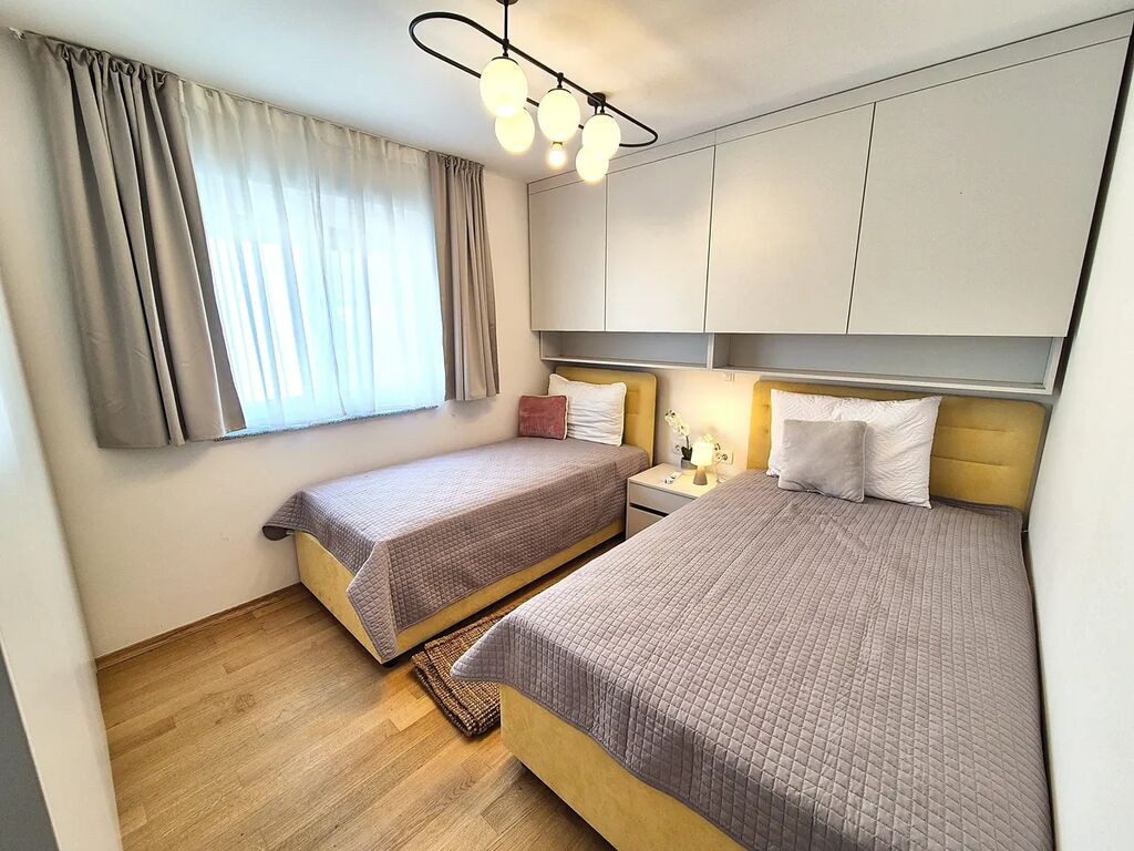 Apartmán o rozloze 79,85 m2 je umístěný ve druhém podlaží budovy a sestává z chodby, koupelny, dvou ložnic, obývacího pokoje s kuchyní a jídelnou s přístupem na krytou velkou terasu. K apartmánu náleží část zahrady o rozloze 52 m2 a jedno parkovací stání. Apartmán je zařízen kvalitním nábytkem na míru , má bezpečnostní dveře, klimatizace ve všech místnostech.