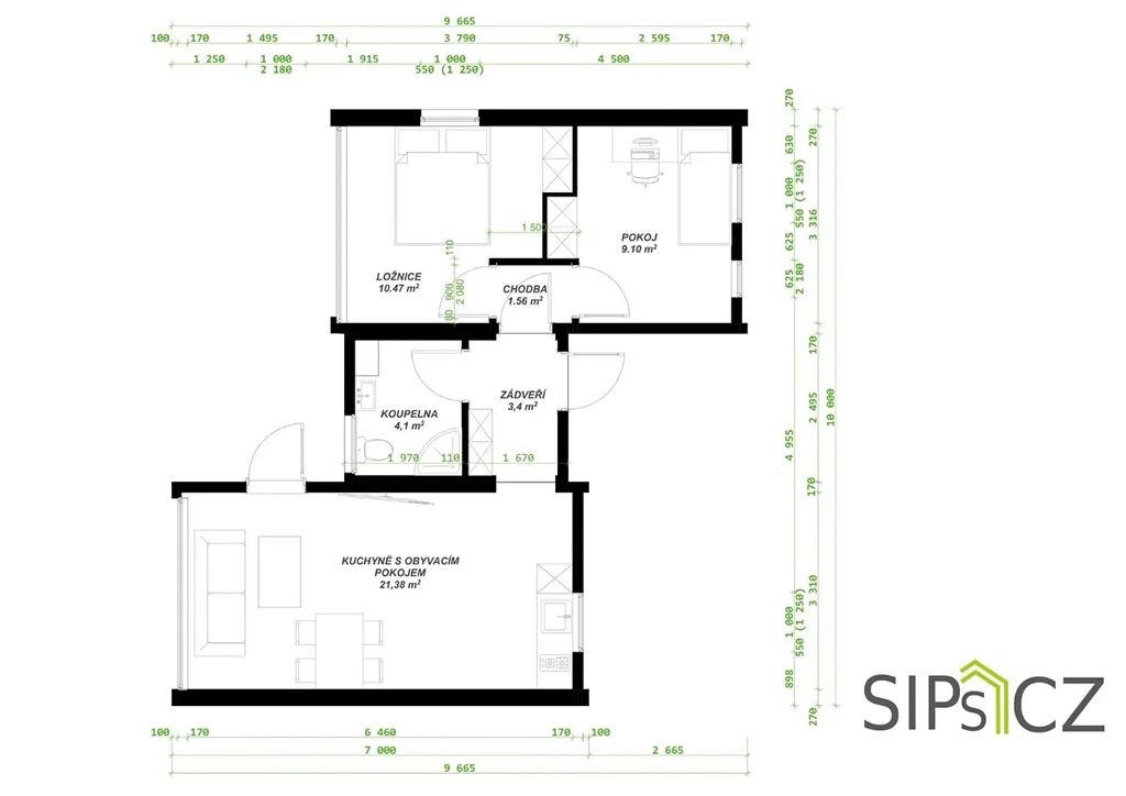 Přízemní dům se skládá z obýváku s kk o výměře 21,38 m2, ložnicí o výměře 10,47m2, dětským pokojem o výměře 9,1m2, WC a koupelnou s výměrou 4,1m2 a zádveřím o výměře 3,4m2. Dům lze dispozičně upravit, klientské změny jsou rovněž možné (bez příplatku).