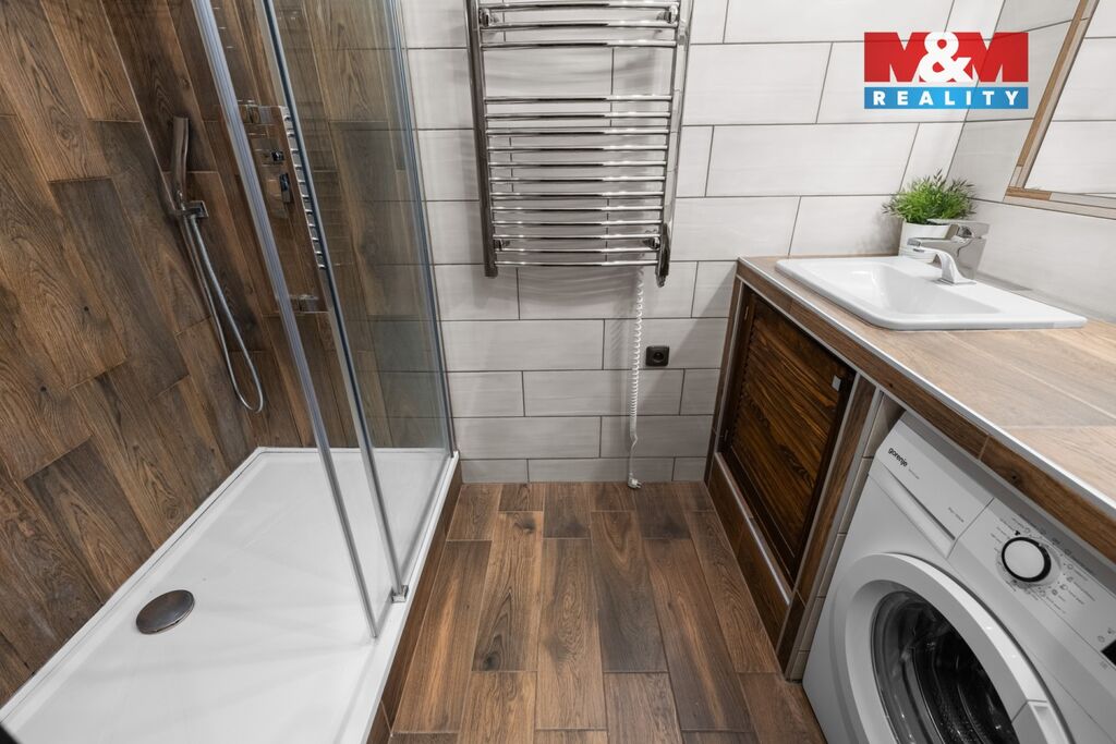 Koupelna a WC zaujmou moderním a kvalitním obkladem v dekoru dřeva.