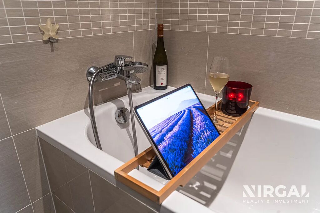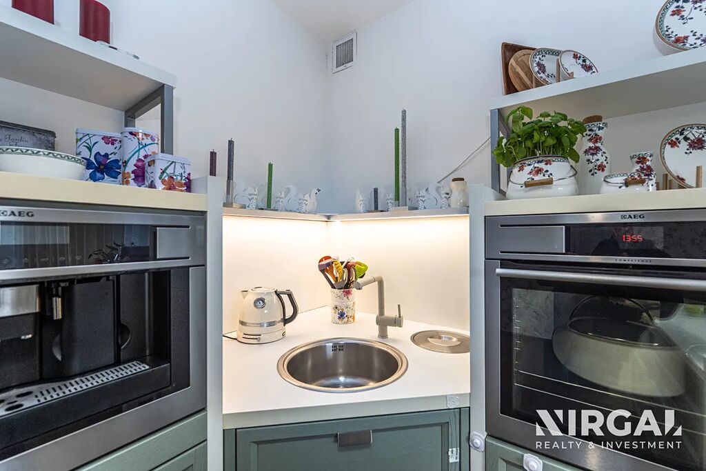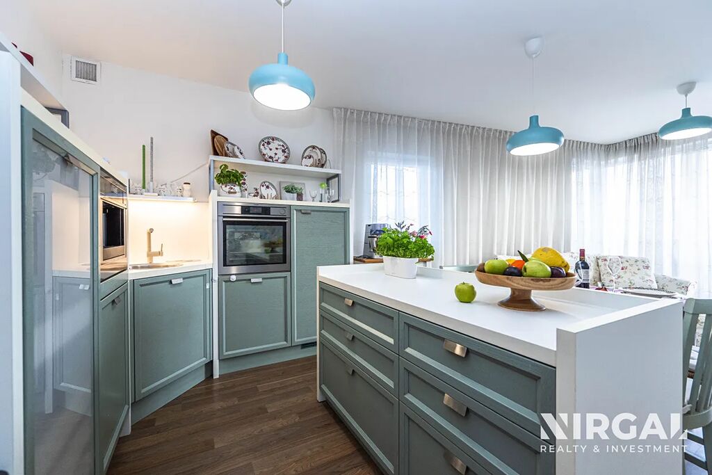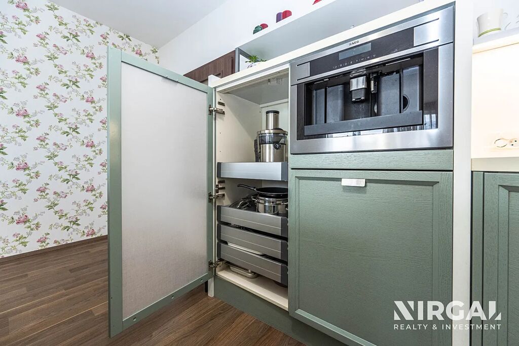 Byt se prodává kompletně zařízený, včetně individuálně navrženého nábytku na míru z kvalitních materiálů. Najdete zde dvě lednice, plně vybavenou kuchyňskou linku se spotřebiči, dokonce i s nádobím značky Villeroy & Boch a nadčasové prvky, které zaručují pohodlí i dlouhou životnost interiéru.