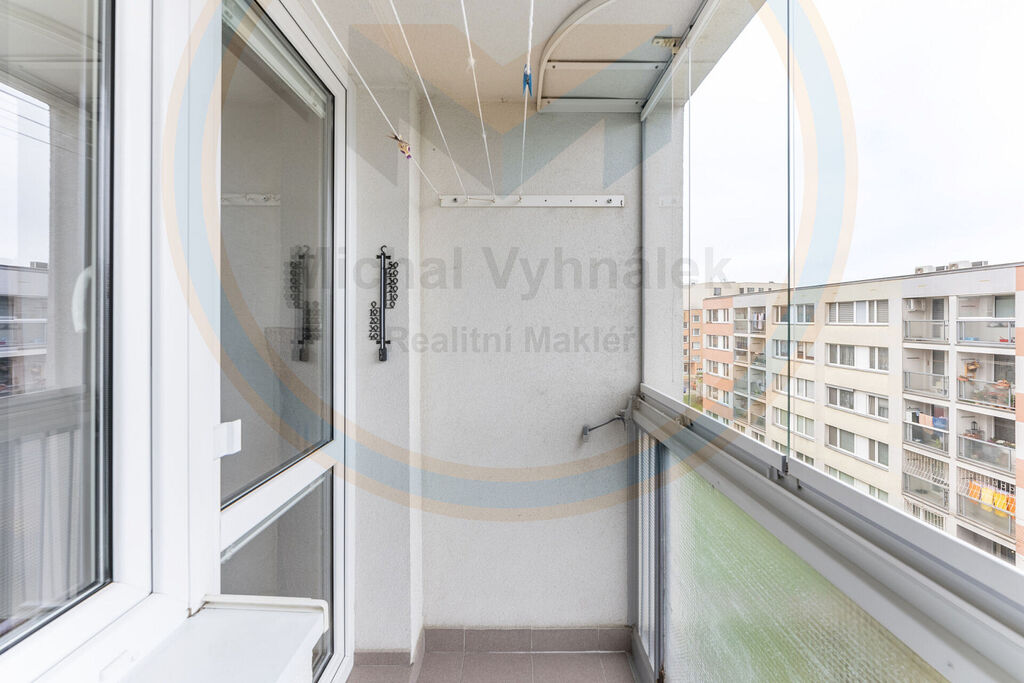 Dispozice je praktická: dva neprůchozí pokoje, z nichž větší má vstup na lodžii, a obývací pokoj spojený s plně vybaveným kuchyňským koutem, doplněný o prakticky řešený policový systém. Vestavěný úložný prostor v chodbě přidává další komfort.