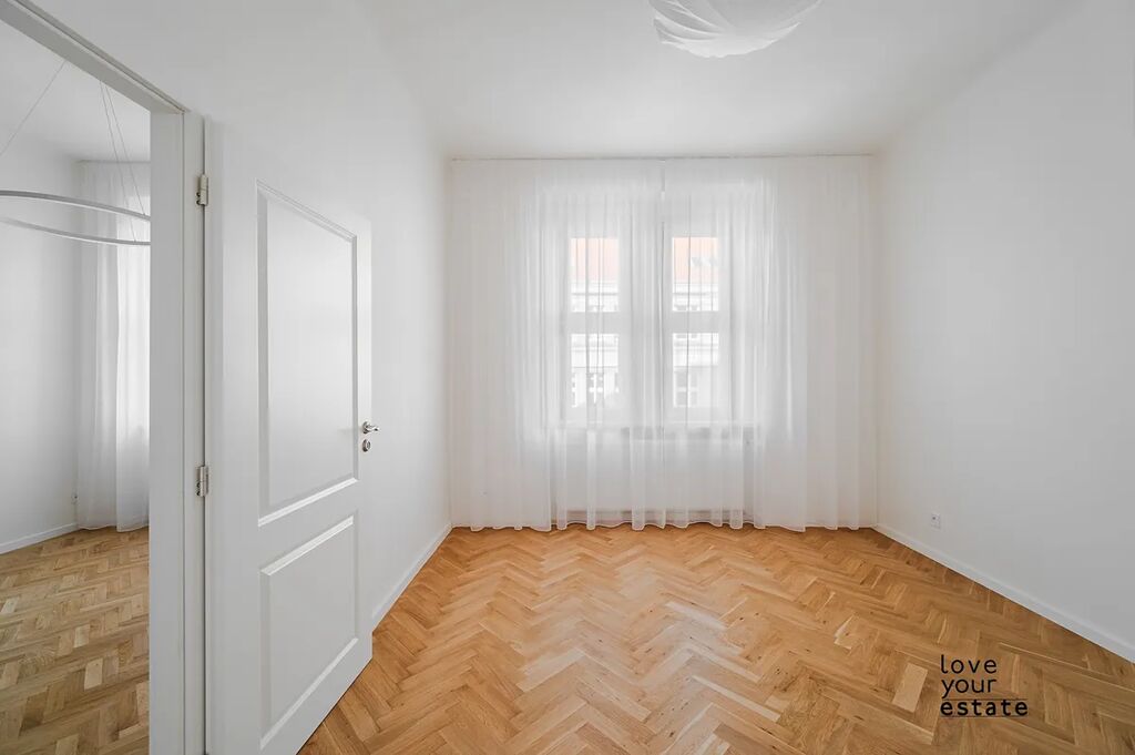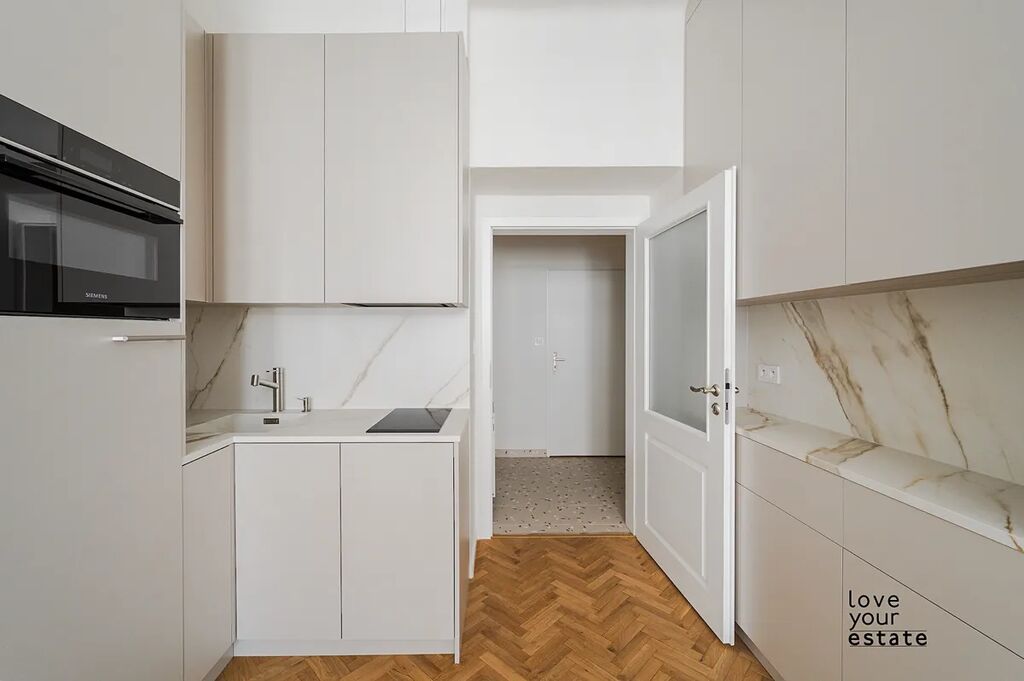 Byt samotný je ve vysokém standardu, dřevěné podlahy, vysoké stropy, kuchyňská linka s keramickou pracovní deskou i dřezem, spotřebiče Siemens...