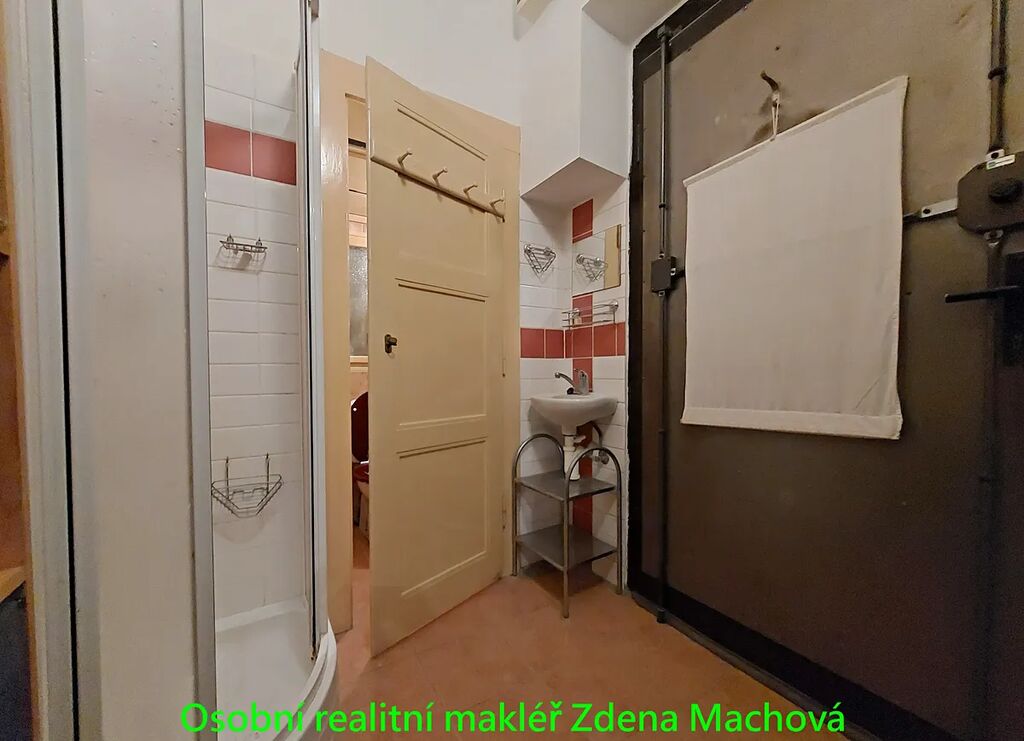 Koupelna je řešena sprchovým koutem je situována v malé vstupní předsíni, kde se nachází také botník. V předsíni je i vchod na samostatné WC s oknem do světlíku. Podlahu tvoří lino a dlažba. Vytápění je řešeno plynovými WAW. K bytu náleží sklep, který je zahrnut v ceně nájmu.