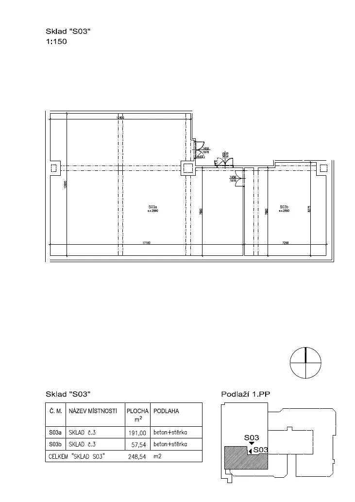 Sklad má plocha 248 m2 a skládá se ze dvou místností.