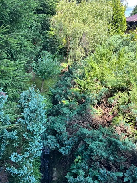 Pozemek 1 534 m² plný vzrostlé zeleně, rozdělený na relaxační zónu a pěstitelskou část.