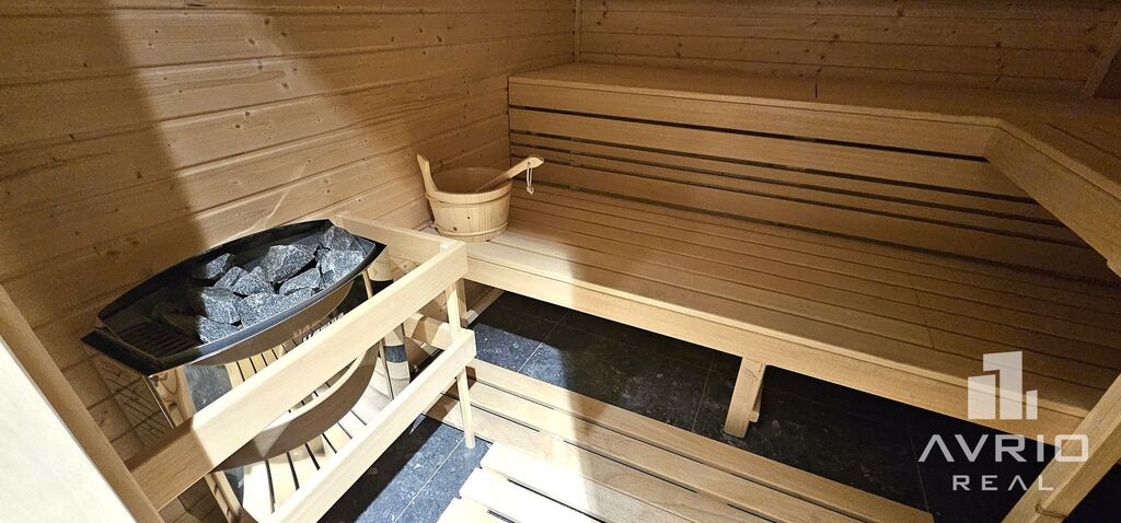 - designová kuchyňská linka se všemi vestavěnými spotřebiči (lednice s mrazákem, myčka, pračka, trouba, varná deska, mikrovlnka)