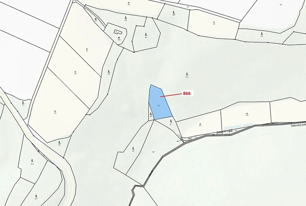 Ostatní plocha o výměře 1277 m2, parcelní číslo 866, podíl 1/1, katastrální území Malý Dešov, obec Dešov, obec s rozšířenou působností Moravské Budějovice, okres Třebíč, Kraj Vysočina.