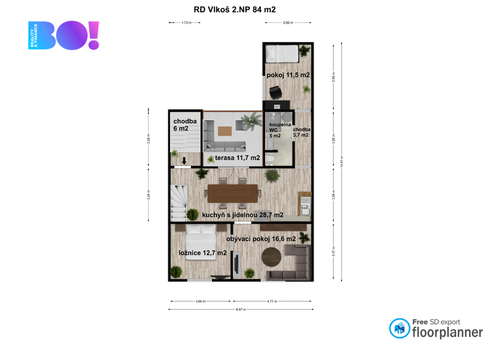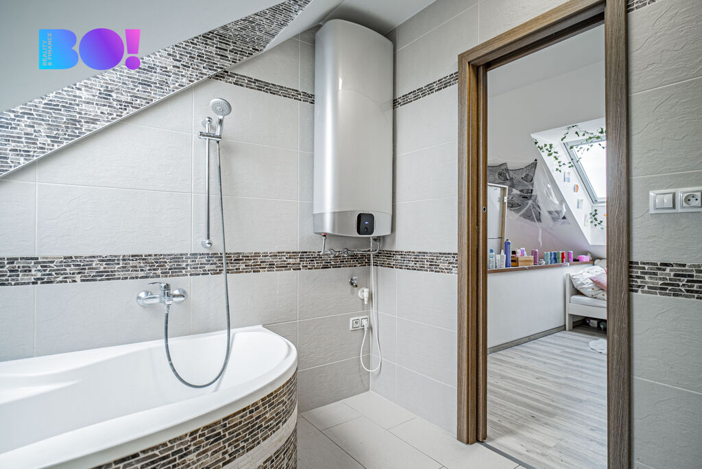 Dvě plnohodnotná obytná patra + podkroví s vlastním zázemím – možnost rozdělit na více jednotek.
