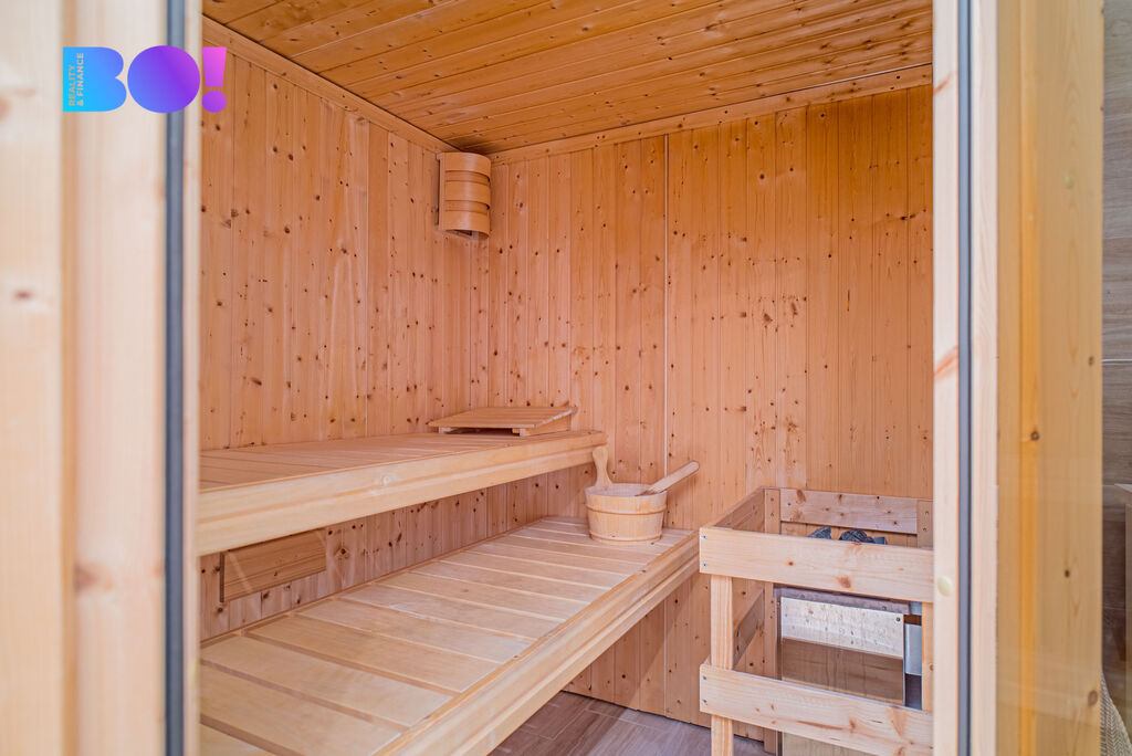 Velká wellness zóna – finská sauna, vířivka, sprcha a WC pro relaxaci.