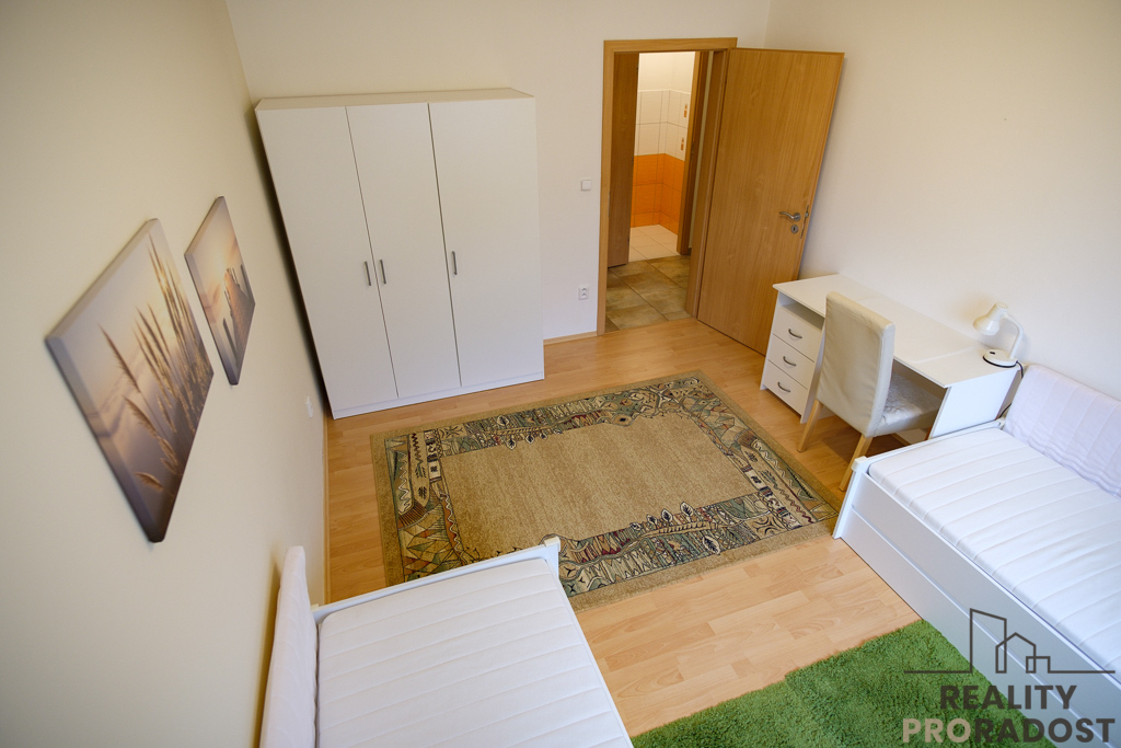 Byt je kompletně vybaven nábytkem – rohová sedačka, jídelní stůl, dva kancelářské stoly, židle, dvě postele, skříň, lednička, pračka…viz foto.