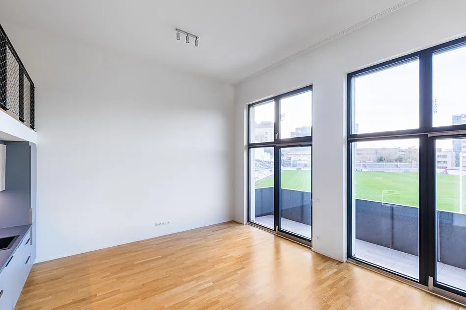 Studio 1+kitchen with an area of 67 m2 with a spacious balcony of almost 10 m2 and a cellar of 4 m2 in the popular location of Žižkov. The exceptional two-floor space is directed to U Viktorie Street, with a view of the green area of the Viktoria Žižkov football stadium.