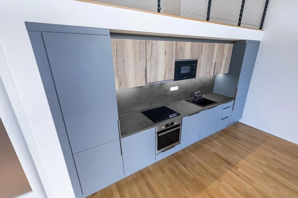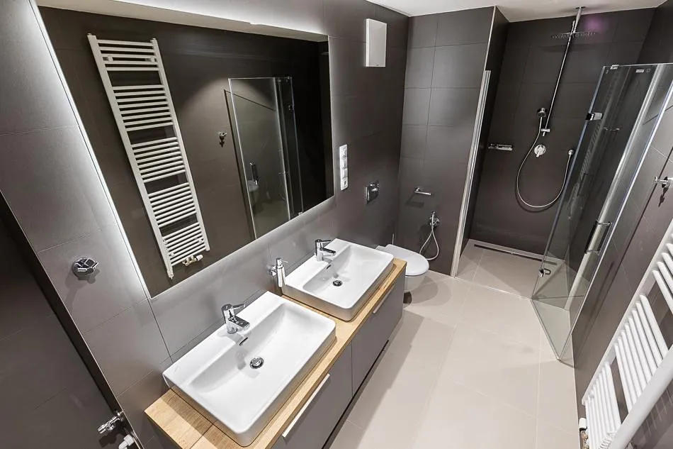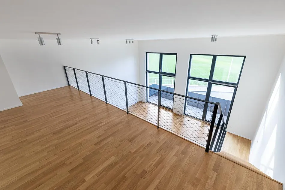 High-quality design and equipment, front window blinds, wooden windows with insulating triple glazing, large-format tiles, Laufen Pro sanitary ware, bidet showers, oak floors with underfloor heating, above-standard door height of 2.1 m, videophone, access to the building with a chip.