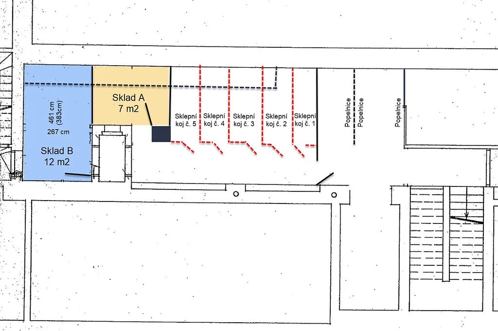 Nabízíme na pronájem od 1. ledna suchý suterénní sklad o rozloze 19 m2 s vysokými stropy, Budečská ulice, Praha 2, Vinohrady. Sklad má dvě místnosti, každá se samostatným vstupem ( dle plánku na fotografii ). Sklad je v budově přímo vedle Vinohradské tržnice. Přístup do skladu je po schodech, bez výtahu. Sklad je suchý a teplota ve skladu je celoročně poměrně konstantní (pod 15 stupňů jsme nenaměřili). Dále je přístup na společné WC. Sklad nemá zásuvky, ani vodu nebo kanalizaci, ale má osvětlení. Objekt je střežen kamerovým systémem.