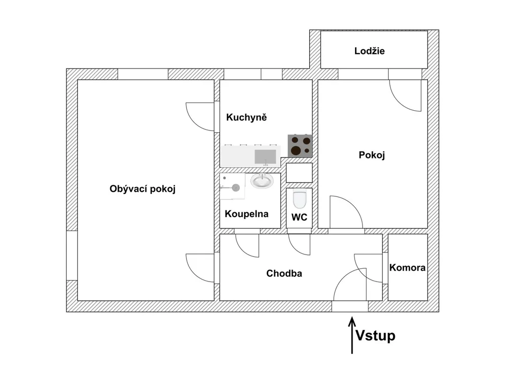 Byt je z části v původním stavu, velice dobře udržovaný, vymalovaný a čistý. Před předáním se ještě zrenovují podlahy a je možnost byt dovybavit. Dispozici tvoří vstupní chodba, komora, dva pokoje, koupelna, samostatné WC a prostorná kuchyně. Součástí bytu je také lodžie, která poskytuje příjemné místo k odpočinku s výhledem do klidné části okolí. K bytu dále náleží další komora umístěná na patře a sklepní kóje v suterénu domu.