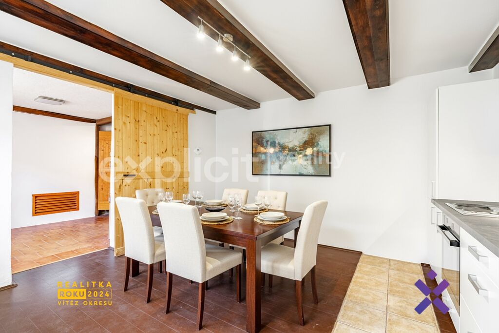 Po pravé straně je umístěna kuchyně vybavená linkou s vestavěnými spotřebiči (trouba, varná deska, lednice). Místnost lze využít jako jídelnu, nebo zde vytvořit obývací zónu a propojit tak kuchyň s příjemným společenským prostorem.