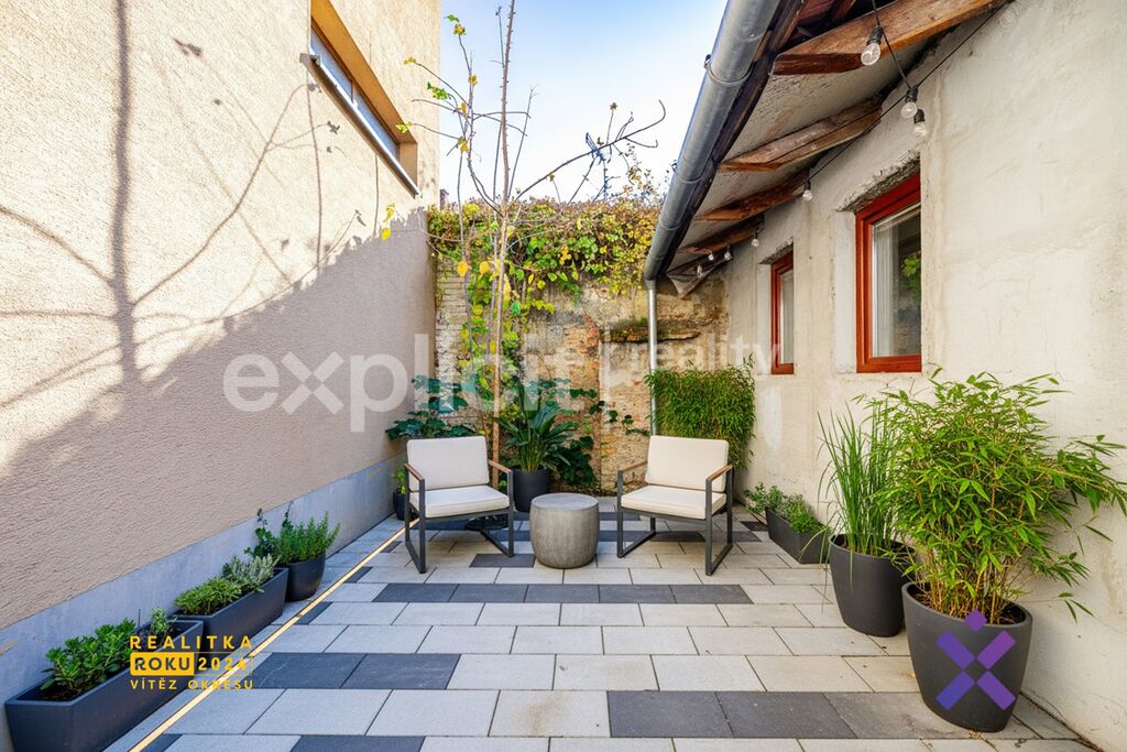 K domu náleží i malá zahrádka či dvorek, který poskytuje prostor pro posezení nebo pěstování květin.