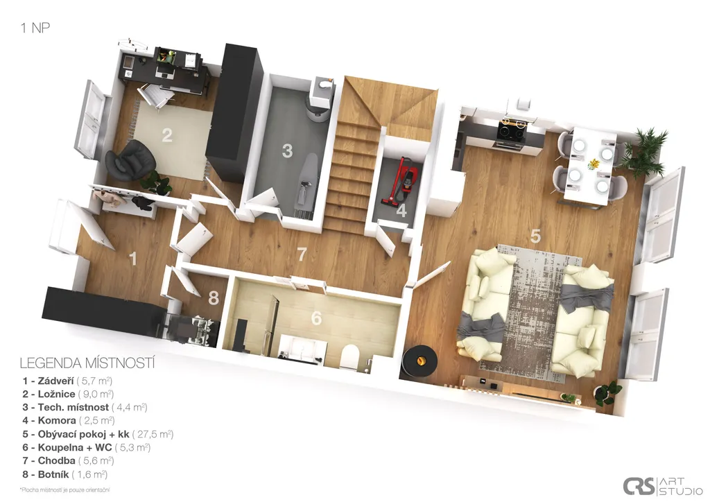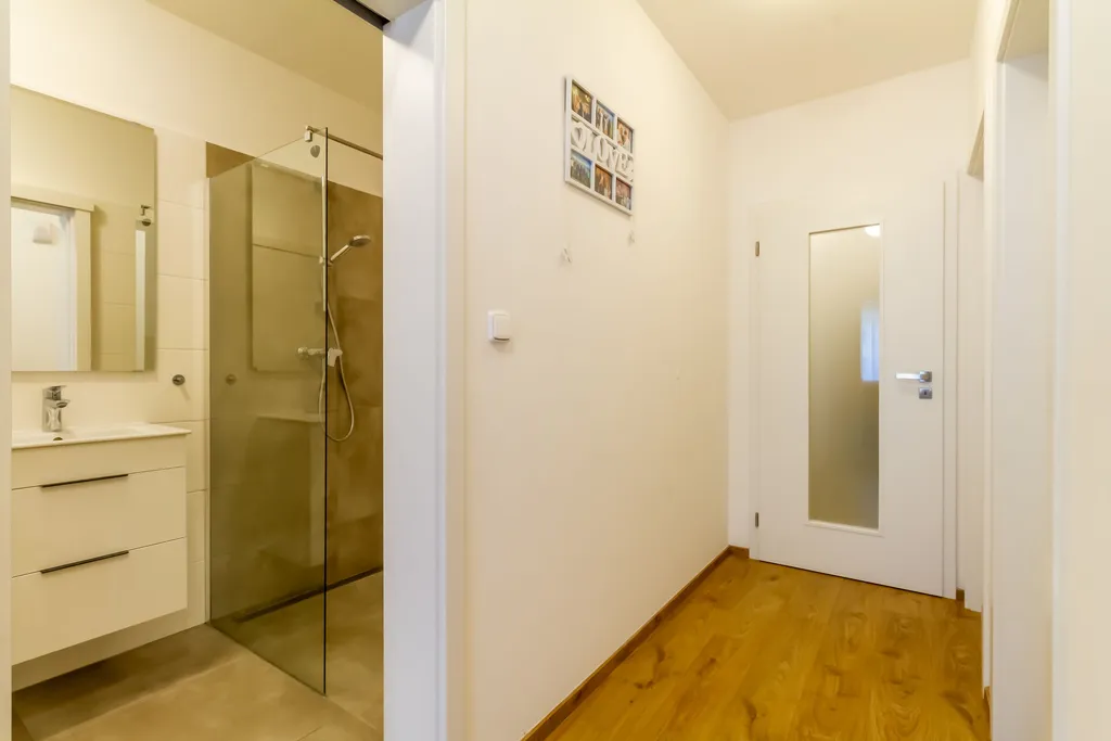 Po vstupu do domu vás přivítá prakticky řešená zádveřní část s velkou šatnou, která usnadňuje každodenní chod domácnosti a poskytuje dostatek úložného prostoru pro obuv, bundy i sportovní vybavení. V přízemí nechybí ani pracovna, ideální pro home office nebo pokoj pro hosty. Dále se zde nachází koupelna se sprchovým koutem a toaletou.