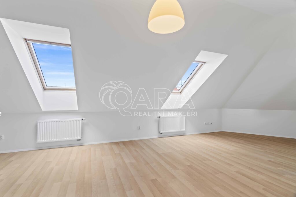 V 5. patře se nachází prostorný obývací pokoj s vybaveným kuchyňským koutem (lednice s mrazákem, elektrická trouba, indukční varná deska, myčka nádobí, digestoř, dřez), ložnice a koupelna se sprchovým koutem, umyvadlem a toaletou. V 6. patře je samostatný pokoj vhodný jako ložnice, pracovna nebo pokoj pro hosty. Byt je vybavený klimatizací, nezařízený, připravený k okamžitému nastěhování.