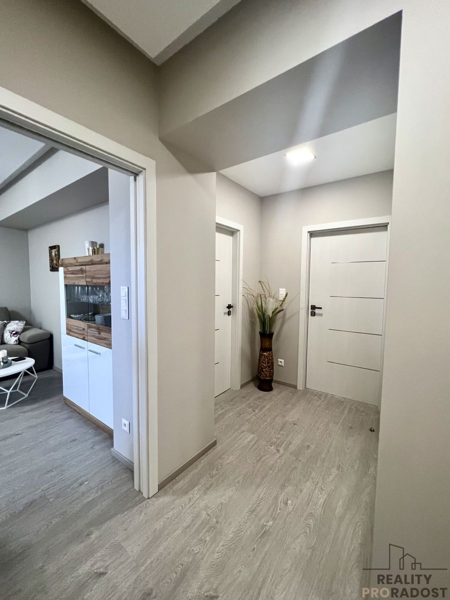 V celém bytě jsou kompletně vyměněné vinylové podlahy, v koupelně a na toaletě je položená dlažba. Pokoje a chodba mají noční svícení s návěsným stropem. Dveře firmy Sapeli – moderní bezfalcové s hladkou linií dveří a zárubní, ze kterých nic nevyčnívá.