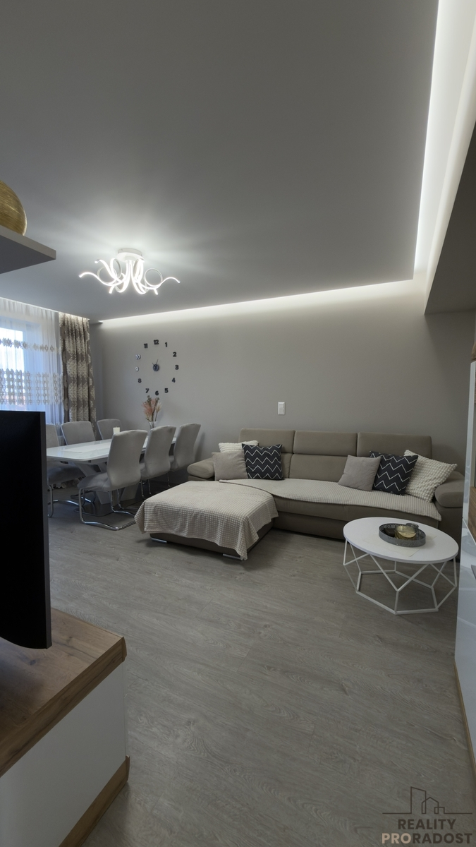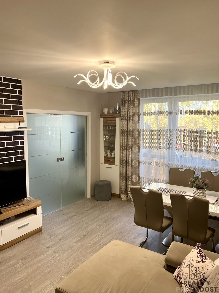 Prodej bytu přibližně 86m², byt 3+1 + 2 balkony + garážové stání + sklep + kóje. Byt je po kompletní rekonstrukci včetně rozvodů elektřiny, topení a nových topných těles. Topení je zajištěno centrálně pomocí plynu. V bytě jsou kompletně vyměněny rozvody vody a topení. Dostatek úložného prostoru poskytuje šatna. Kuchyně je nově vyrobená truhlářem a vybavená vestavěnými spotřebiči s dostatkem úložného prostoru.