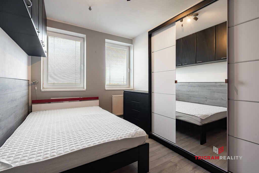 Kuchyně je vybavena lednicí s mrazákem, myčkou, indukční varnou deskou, el. troubou a mikrovlnnou troubou. Prostorný obývací pokoj s velkou sedací soupravou, TV a konferenčním stolkem, plynule navazující na kuchyňský kout. Ložnice je včetně postele a nechybí ani dostatek úložného prostoru. Součástí koupelny je sprchový kout, kombinovaná pračka se sušičkou a WC. Byt má i komoru přímo v dispozici.
