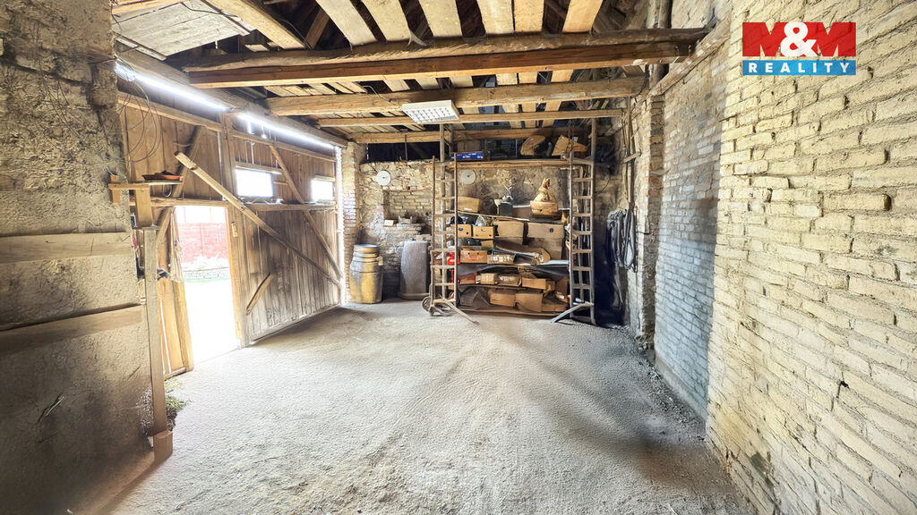 Chalupa nabízí spoustu potenciálu a úložného prostoru. Prostornou stodolu, dílnu, velký sklep a potenciál půdní vestavby.