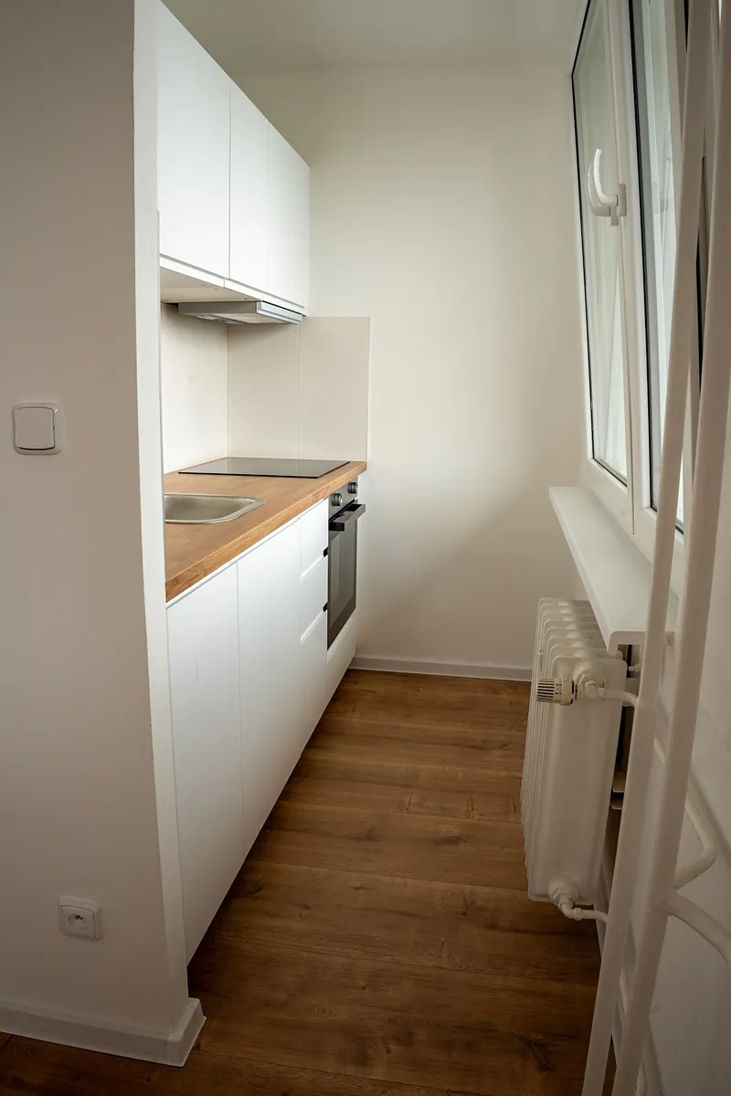 Nabízíme k prodeji světlý byt 1+kk o výměře 37 m² vč. lodžie a komory na patře po celkové rekonstrukci, která byla dokončena 6/2025. Byt prošel kompletní renovací včetně nových rozvodů elektřiny, zděného jádra, nových podlah, štuků a moderní kuchyňské linky. K bytu náleží zasklená lodžie, která nabízí příjemný prostor k odpočinku s výhledem do okolí.