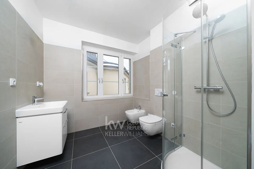 vybavenou sprchovým koutem, WC, bidetem a umyvadlem. Druhá část bytu zahrnuje