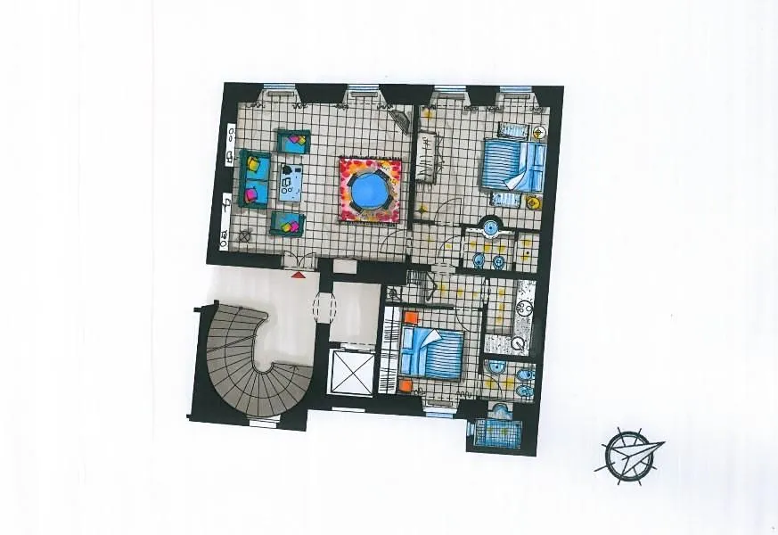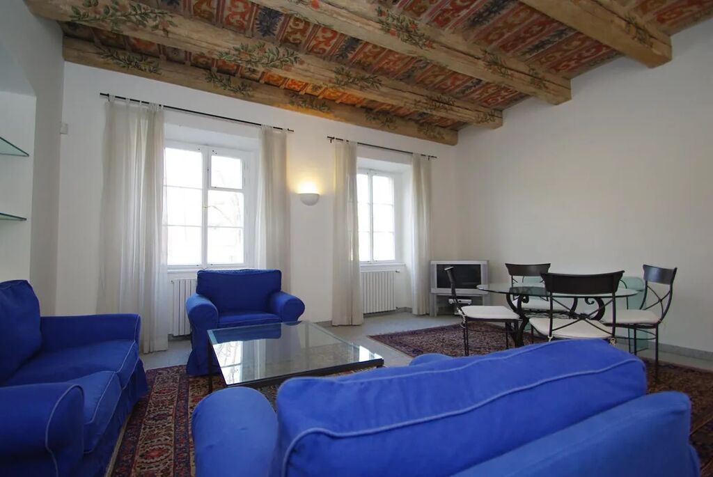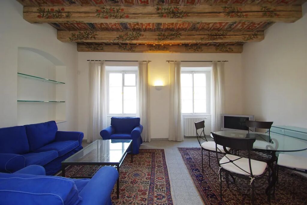 Interiér bytu je vkusně zařízen orientálními koberci a renesančními klenbami a dispozičně se skládá z obývacího pokoje (2 pohovky, satelitní TV, DVD) s jídelním stolem, originálními malovanými barokními stropy a krbem, kuchyně se spotřebiči (myčka, mikrovlnná trouba, elektrická varná deska, lednice), dvou ložnic, jedna s vestavěnými skříněmi, dvou koupelen (jedna s rohovou vanou, druhá se zapuštěnou kachlovou vanou), komory a vstupní chodby s vestavěnou skříní.