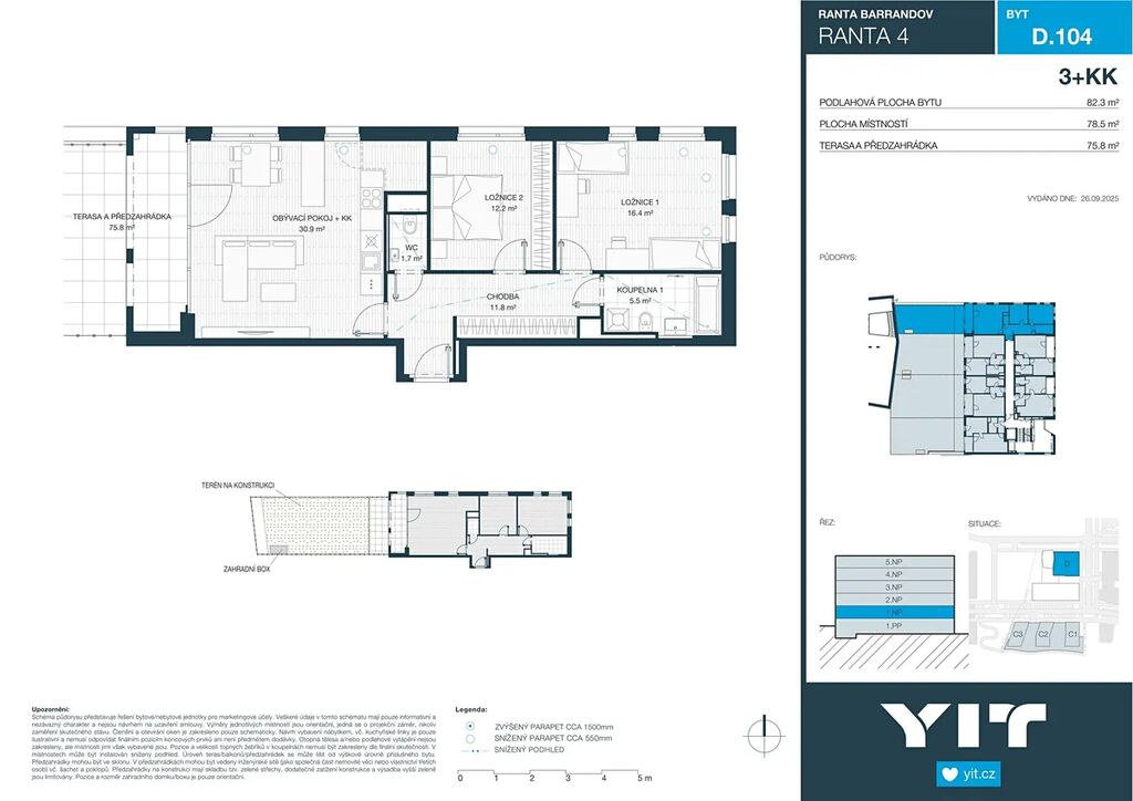 Byt 3+kk o celkové rozloze 82,3 m² je situován v 1.NP projektu RANTA Barrandov IV. Cena zahrnuje bytovou jednotku, sklepní kóji a DPH.