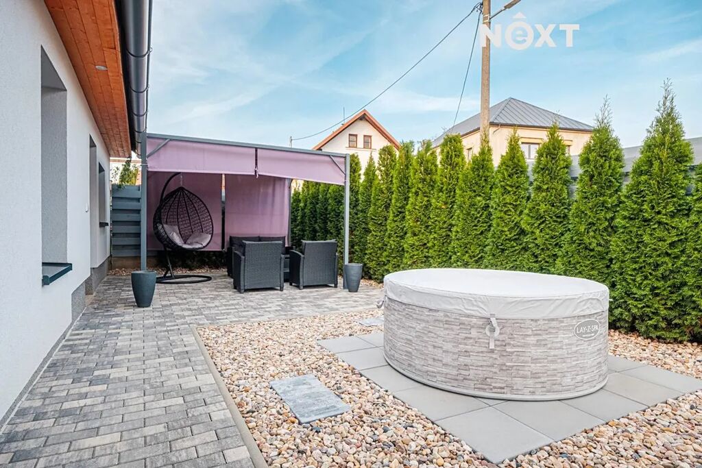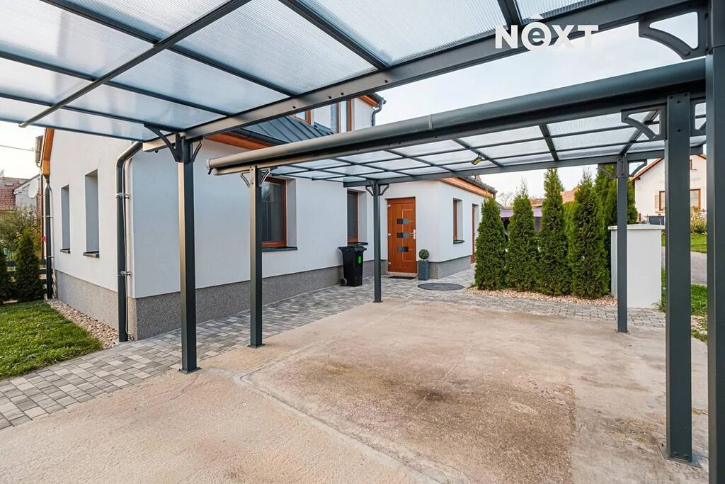 U domu zastřešené stání pro dvě auta. Pergola pro příjemné posezení venku. Pozemek kompletně oplocen.
