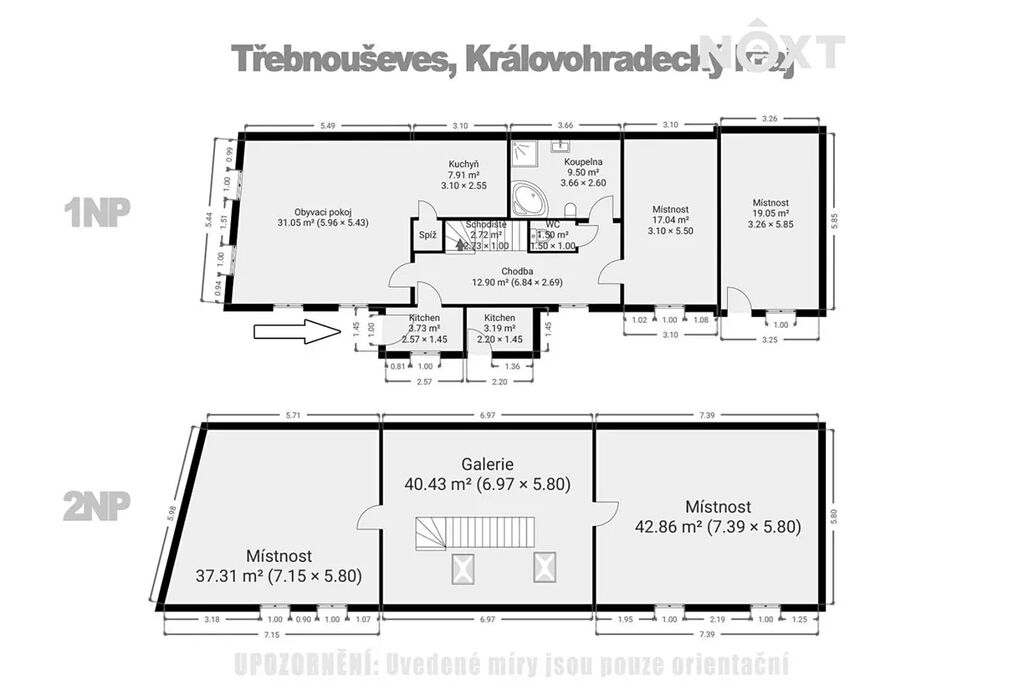 1NP - zádveří, chodba, obývací pokoj s kuchyňským koutem, spíž, koupelna - vana sprcha, WC, samostatné WC, ložnice, technická místnost - plynový kotel a el. bojler na TUV, dílna,