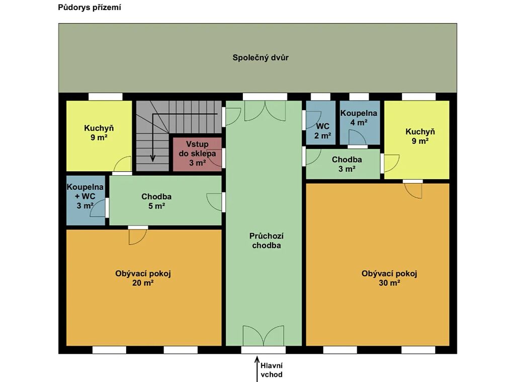 V přízemí se nacházejí dvě plně samostatné bytové jednotky, každá s vlastní kuchyní, koupelnou a obývacím pokojem.