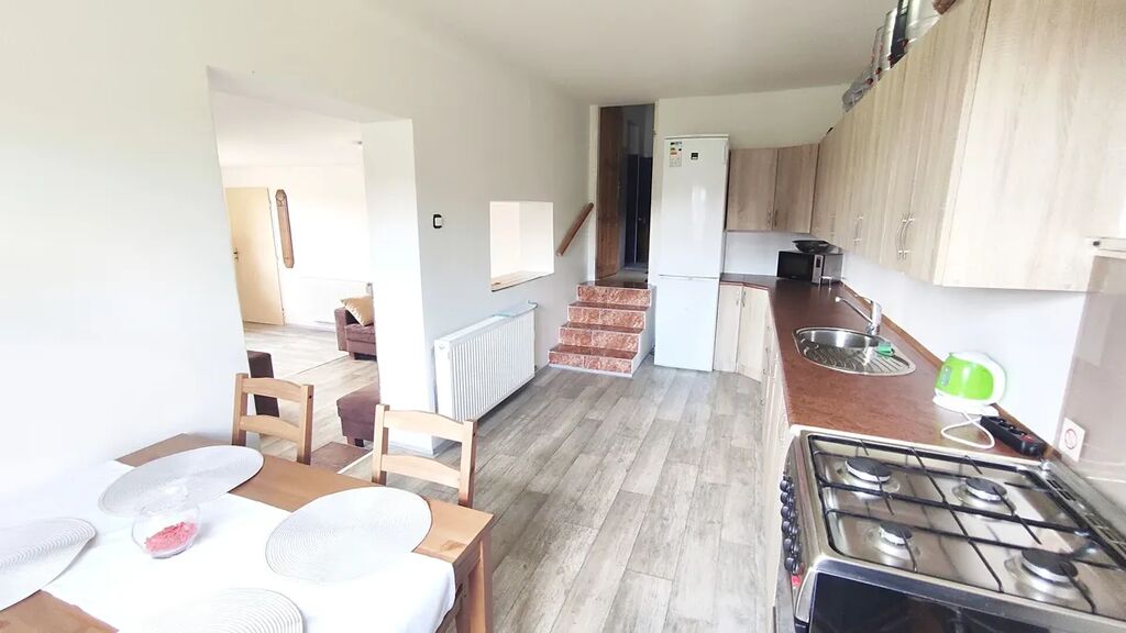 Byt se skládá z prostorného obývacího pokoje propojeného s kuchyní, která je kompletně vybavená kuchyňskou linkou se sporákem, lednicí a stolem se židlemi. Součástí kuchyně jsou také kamna s možností vytápění. Dále je zde ještě samostatná místnost využitelná jako ložnice, dětský pokoj, pracovna nebo hobby místnost. Koupelna je se sprchovým koutem a WC.