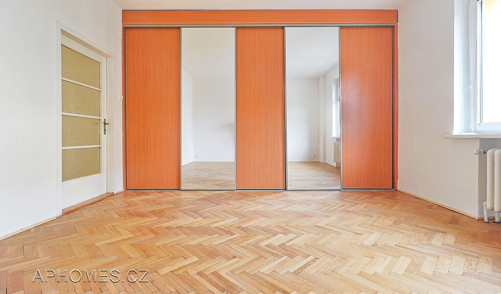 V ložnici je umístěna celo-stěnová vestavěná skříň s posuvnými dveřmi, která je praktickým bonusem, který šetří prostor i náklady na pořízení vlastního nábytku.