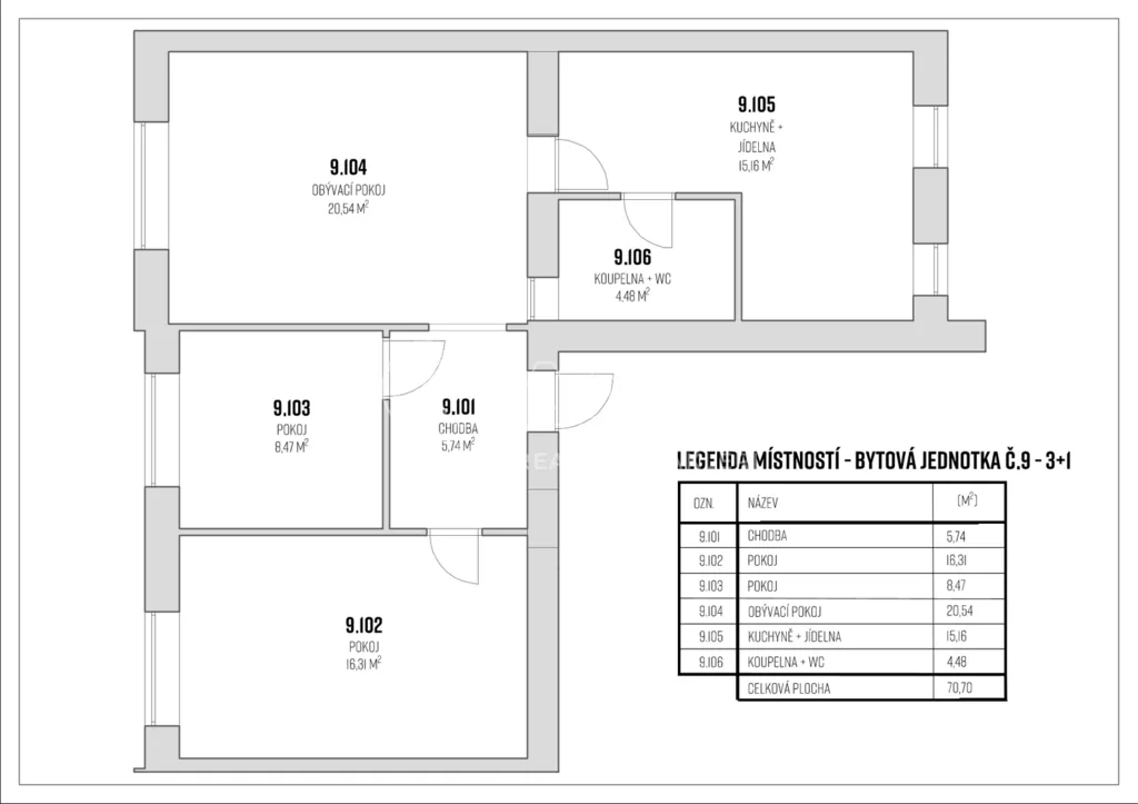 • Obývací pokoj (20,54 m²) – prostorný a přirozeně prosvětlený, západní orientace