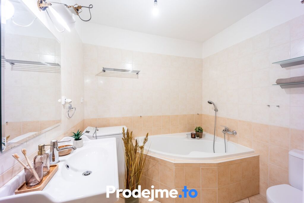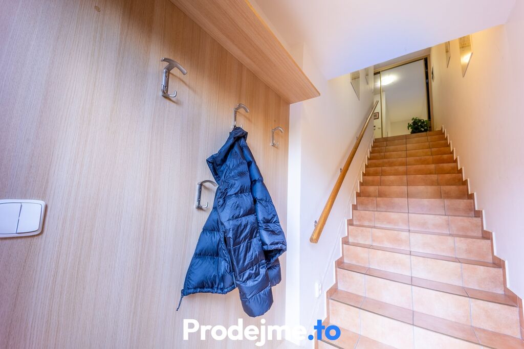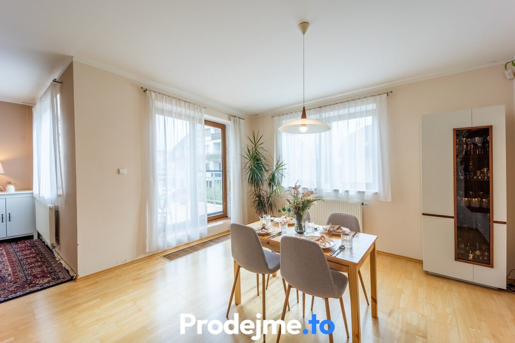 Byt má vlastní vchod v přízemí, obytná část je v prvním patře. Dominantou je velkorysý obývací pokoj s kuchyňským koutem a jídelnou o ploše 50,7 m² a s výborným přirozeným světlem. Kuchyň je plně vybavená (mimo lednici), doplněná o ostrůvek a poskytuje dostatek místa pro vaření i rodinné setkávání. Z jídelny se vstupuje na terasu - ideální pro ranní kávu i letní posezení.
