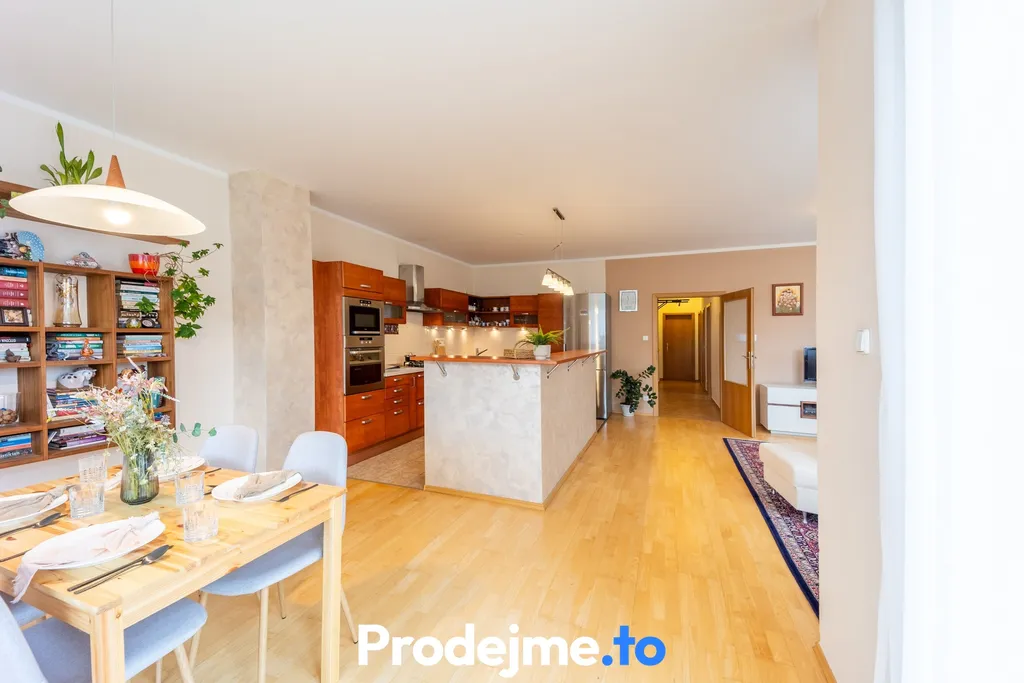 Byt má vlastní vstup v přízemí, obytná část je umístěna v prvním patře, což přirozeně odděluje klidovou a společenskou zónu. Dominantou je velkorysý obytný prostor o ploše 50,7 m². Obývací pokoj, jídelna a kuchyň tvoří harmonický celek plný denního světla. Kuchyň s ostrůvkem je plně vybavena (mimo lednice) a díky otevřenému řešení zůstává ten, kdo vaří, stále součástí rodinného dění.