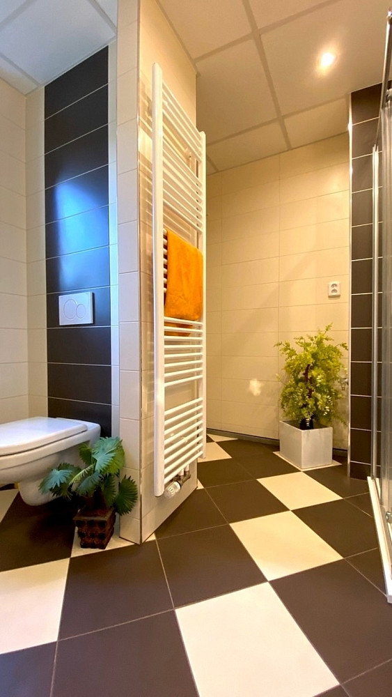 V bytě je instalováno teplovodní podlahové vytápění, které zajišťuje rovnoměrné teplo po celé ploše. Kuchyňská linka v kombinaci bílé, dřeva a chromu je plně vybavena spotřebiči – vestavnou myčkou, elektrickým sporákem s troubou, digestoří a lednicí s mrazákem. Koupelna (7 m²) je laděna do přírodních odstínů a vybavena sprchovým koutem, umyvadlem se zrcadlem a přípravou pro pračku a sušičku. Obývací pokoj (17 m²) působí vzdušně a nabízí pohled do zeleně.