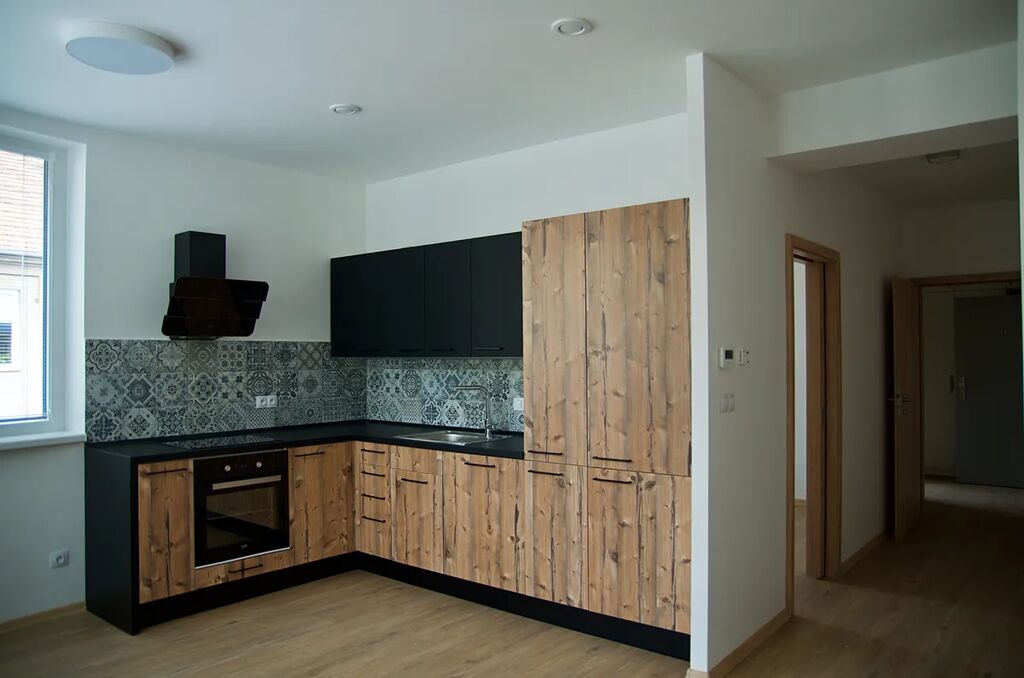Kuchyňský kout je vybaven moderní kuchyňskou linkou s vestavěnými spotřebiči - lednice s mrazákem, varná indukční deska, trouba, digestoř a myčka nádobí.