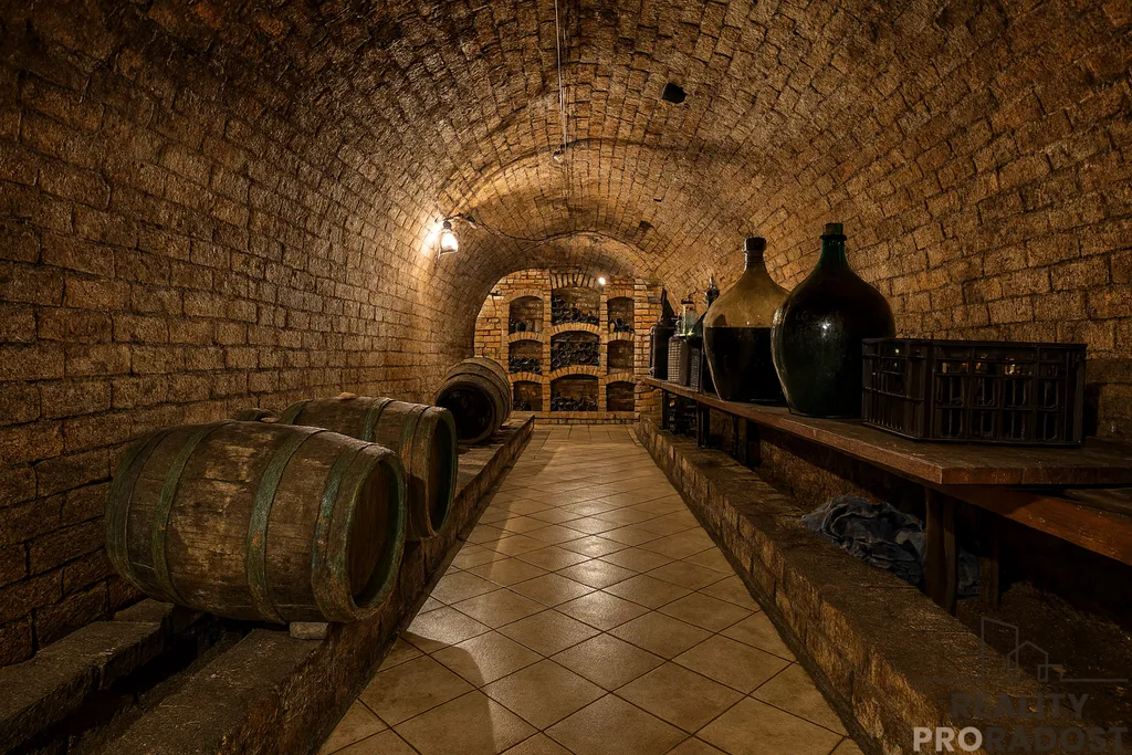 Součástí domu je historický habánský sklep o velikosti 46m2 (+ šíje 10 m2) s nezaměnitelnou atmosférou a nachází se hned vedle skvělého zázemí pro minimálně 20 hostů. Tento prostor nabízí velkou otevřenou místnost 26m2 s kuchyňským koutem 7m2, krbovými kamny a slouží pro oslavy, různé společenské akce, degustace nebo přátelská posezení. V přízemí je opět nové sociální zařízení, které zajišťuje pohodlí hostů.