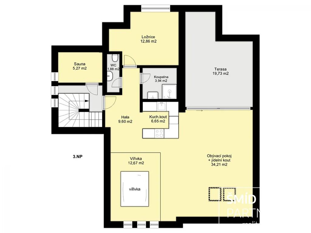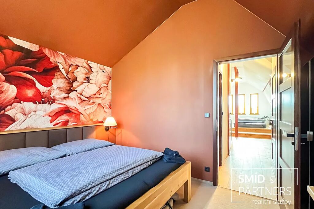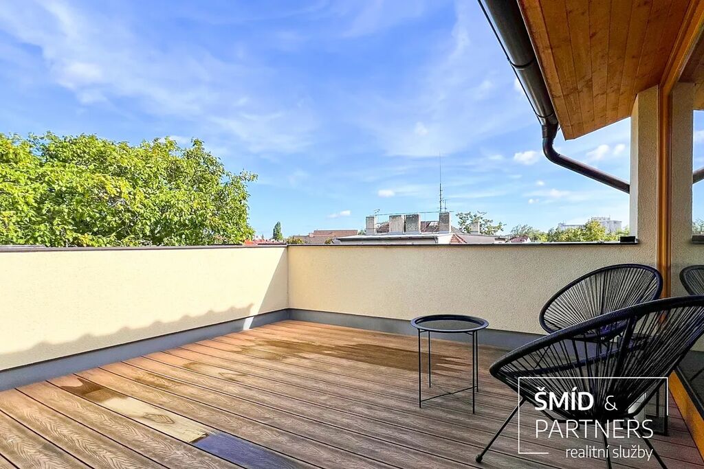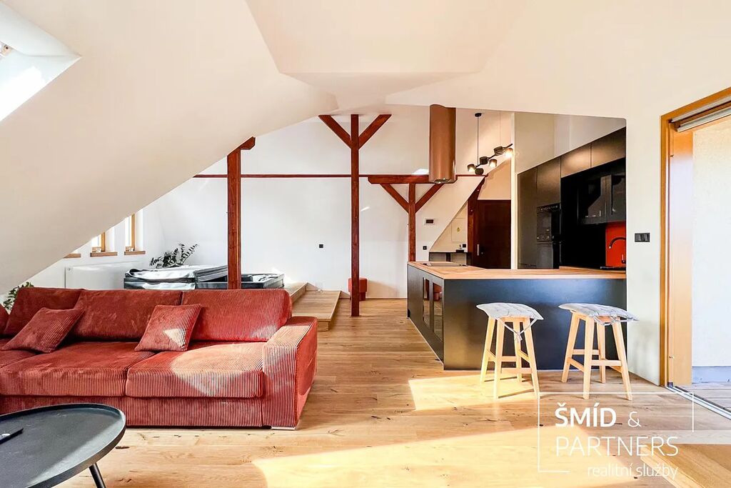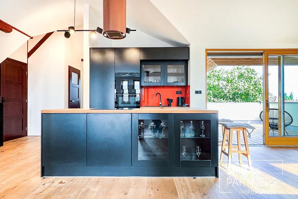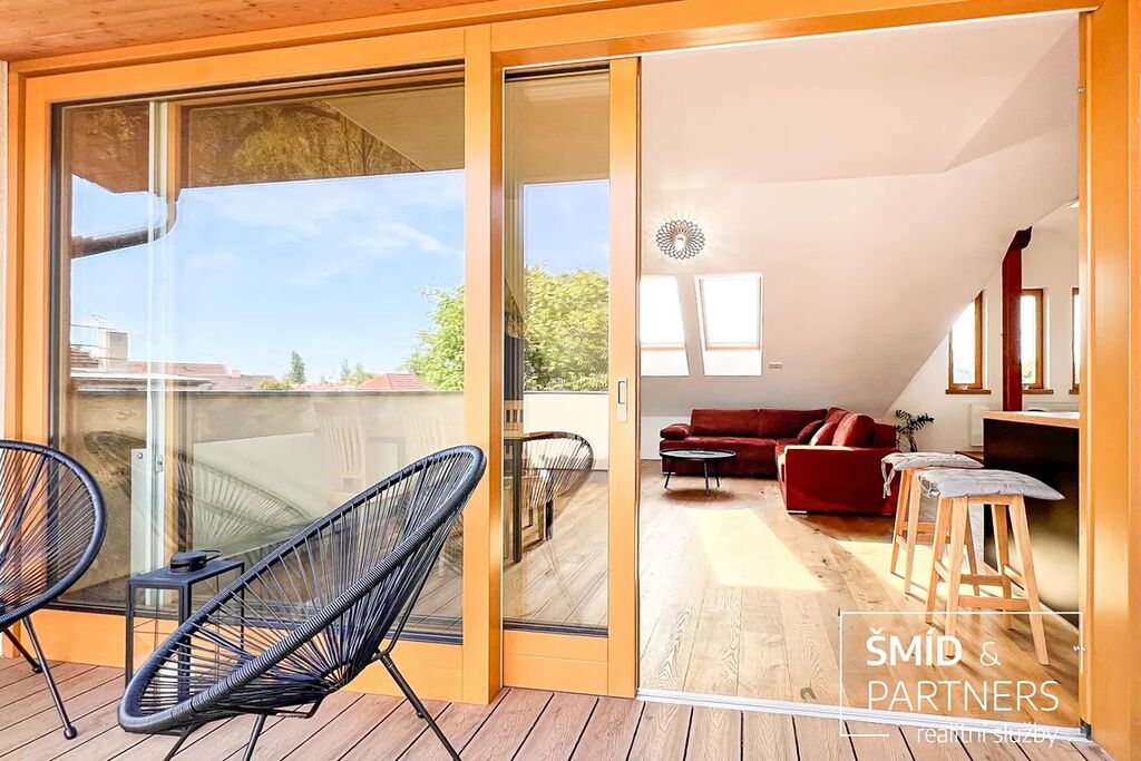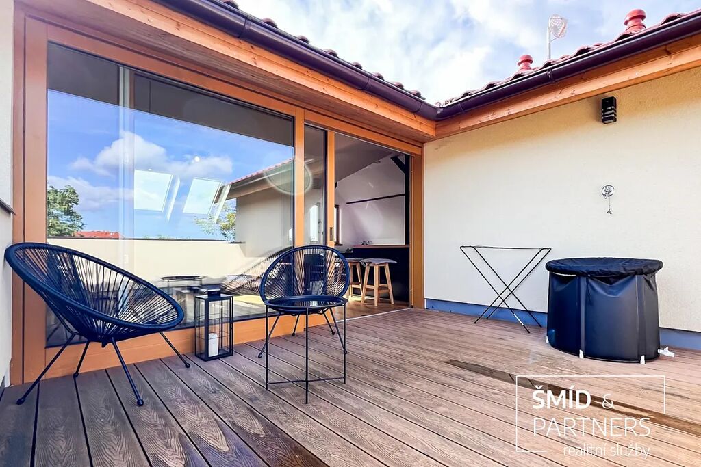 Tento podkrovní byt je luxusně vybaven moderní kuchyní, vířivou vanou, velkou terasou, prostorným obývacím prostorem, saunou a zahradou, která je k dispozici všem vlastníkům domu. Ve spolupráci s architektkou zde vnikl příjemný prostor k bydlení a zároveň místa pro relaxaci. Z terasy je výhled na zahradu, v jejíž zadní části je k dispozici pergola. Díky stromům a vyšším plotům zde můžete strávit čas v poklidu a relativně v soukromí.
