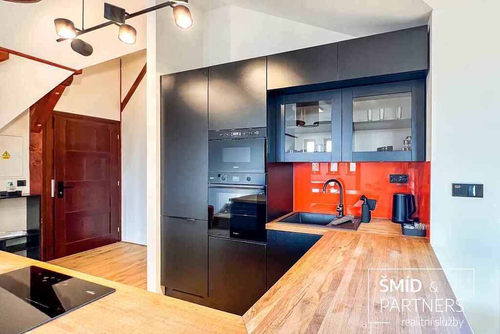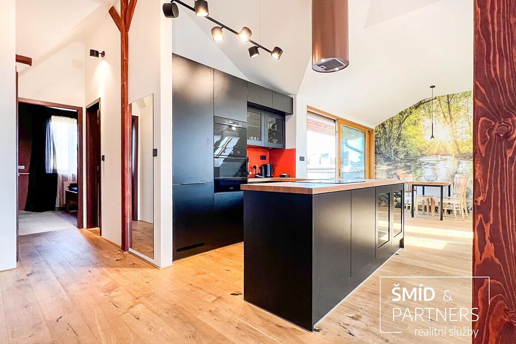 Byt je kompletně vybaven nábytkem. Dřevo, které je zde všude zakomponované a jako použitý materiál vč. podlahy hraje hlavní roli, dodává bytu příjemný a teplý dojem. Celkově byl při rekonstrukci domu kladen důraz na kvalitu použitých materiálů.