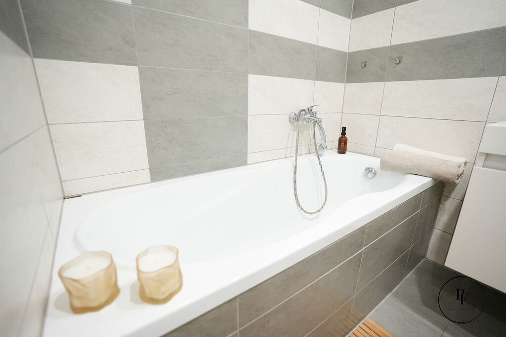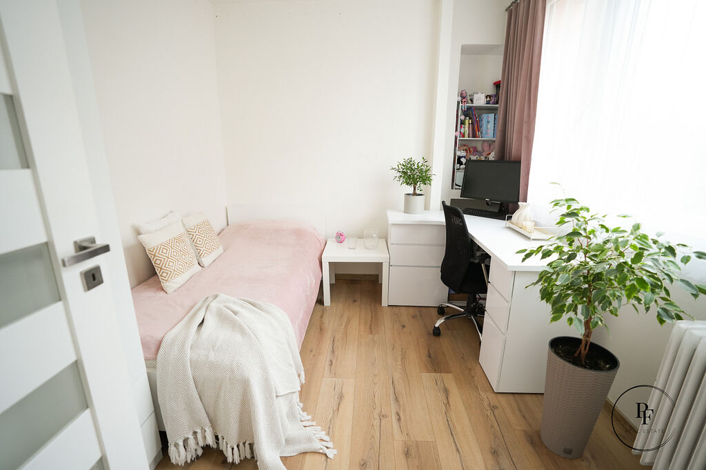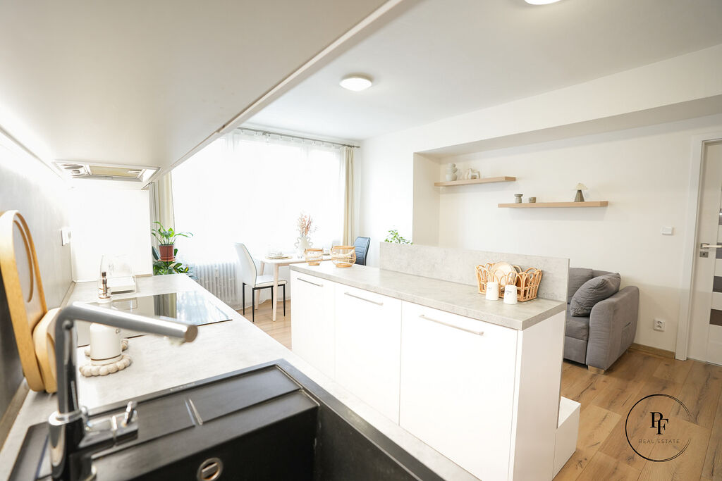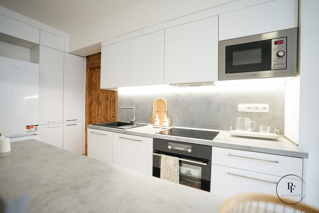Obývací pokoj je propojen s moderní kuchyňskou linkou a ostrůvkem. Kuchyně je vybavena vestavěnou myčkou, mikrovlnnou troubou, varnou deskou a troubou a nabízí dostatek pracovní i úložné plochy. Z obývacího pokoje se vstupuje do dvou samostatných ložnic, které lze využít jako hlavní ložnici, dětský pokoj nebo pracovnu.