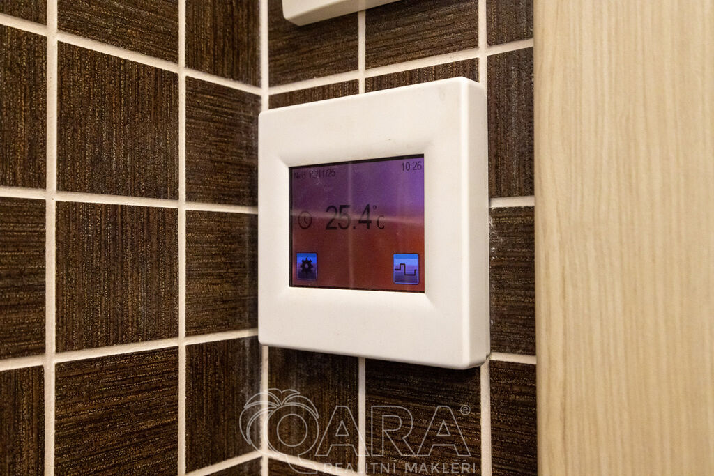 Koupelna má podlahové vytápění, je zde vana, pračka a sušička.
