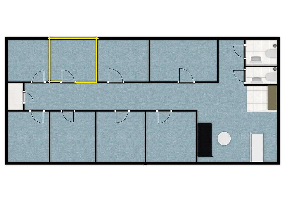 Do objektu vstupujeme přes prostornou vstupní halu v přízemí o výměře cca 17,22 m². Z této haly vede schodiště do 1. patra, kde se nachází samotná kancelář o výměře cca 12 m². Kancelář je klimatizována. Místnost je prosvětlena dvěma střešními okny, které zajišťují dostatek denního světla. K dispozici jsou elektrické zásuvky a husí krk pro natažení internetu nebo kabeláže dle potřeby nájemce. Patro disponuje společnými prostory, které zahrnují vstupní halu o výměře cca 17,79 m². Součástí haly je také kuchyňka o výměře cca 1,60 m², která je vybavená lednicí, mikrovlnou troubou. Na patře se nachází také WC o výměře 1,26 m² a 2,11 m². Jednotlivé kanceláře spojuje chodba o celkové výměře cca 23,70 m².