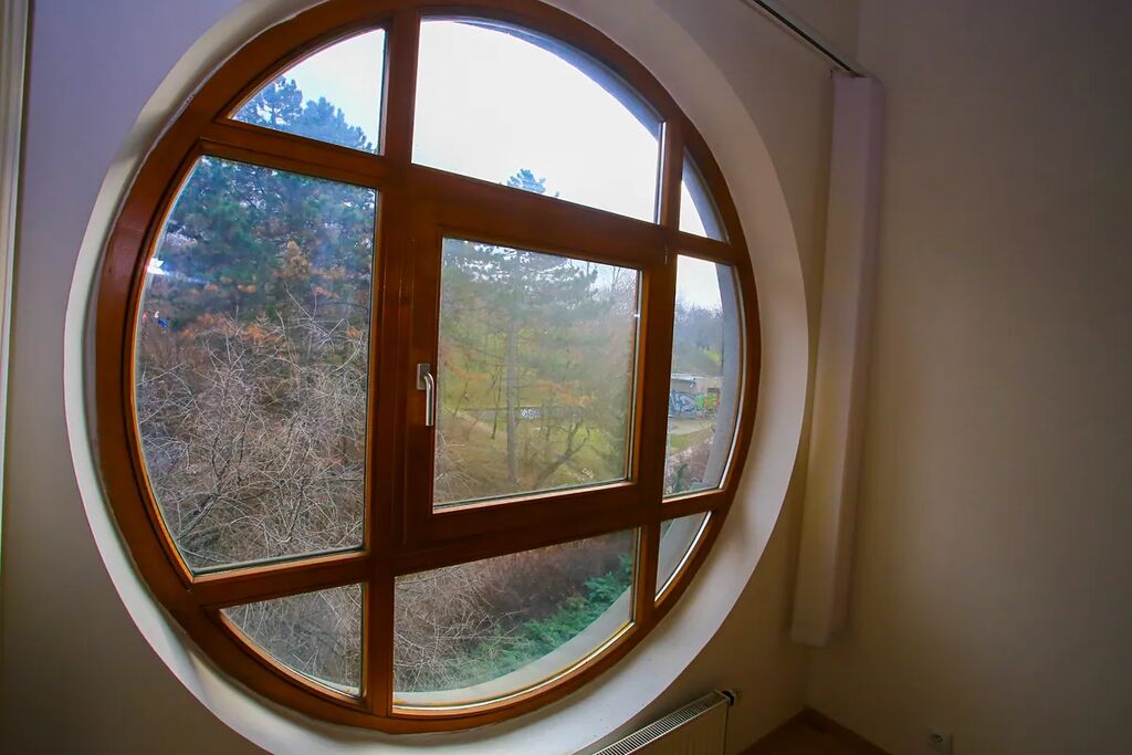 Na podlahách je položena plovoucí podlaha, okna jsou kvalitní dřevěná a ložnici zdobí designové kulaté okno, které dodává prostoru výjimečný charakter.