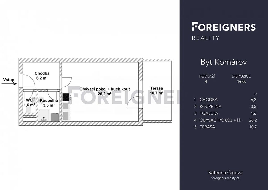 Slunný ateliér 1+kk s velkou terasou a klimatizací – Brno, Komárov.