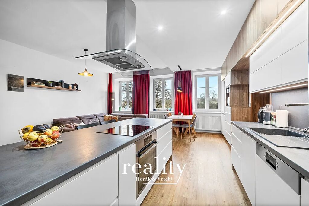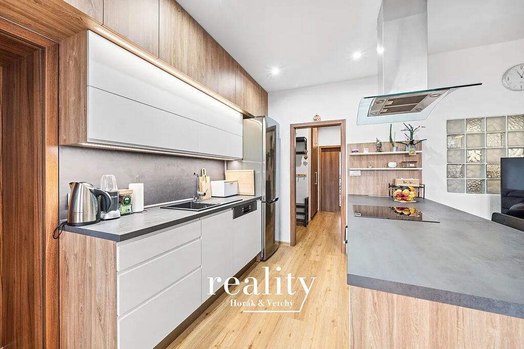 Majitelé tvrdí, že se zde vaří s radostí a já jim to věřím! Krásná linka, která vypadá skvěle na fotkách a naživo je to teprve koncert. Úložné prostory až ke stropu (konečně místo na všechny hrnce, co jste dostali od babičky), Včetně všech klíčových spotřebičů (trouba, digestoř, indukce, myčka) a bonusem je, že jídelní stůl i židle zůstávají! Majitelé si odnesou jen kávovar, mikrovlnku a jejich kulinářské vybavení.