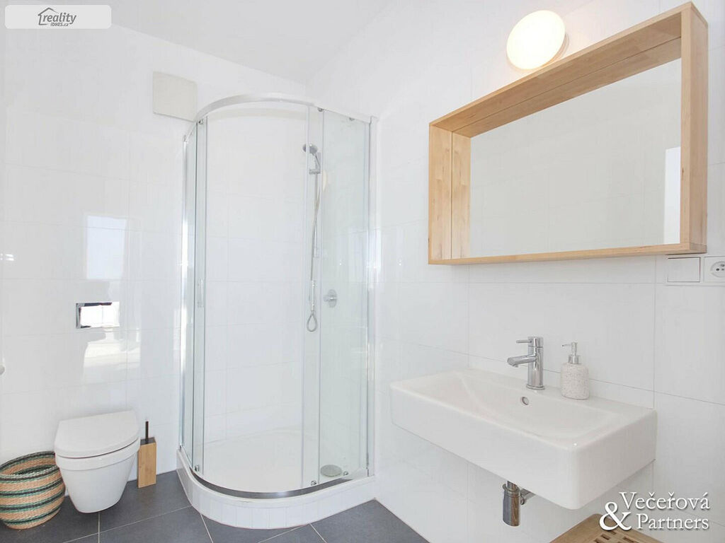Okolo celého bytu je terasa. K dispozici je vybavená kuchyňská linka se spotřebiči včetně lednice spojená s obývacím pokojem, ze kterého se vstupuje na hlavní část terasy. Byt má 3 ložnice, největší ložnice má vlastní koupelnu s WC a sprchovým koutem a svou vlastní terasu. Z prostorné chodby se vstupuje do jednotlivých pokojů, do koupelny s vanou a pračkou, samostatné WC. Každý pokoj má vlastní výstup na terasu. Byt je orientovaný do 3 světových stran. Obývací pokoj je orientován na jih a západ, ložnice na východ. Každé okno má předokenní žaluzie. V bytě je položená nová vinylová podlaha.